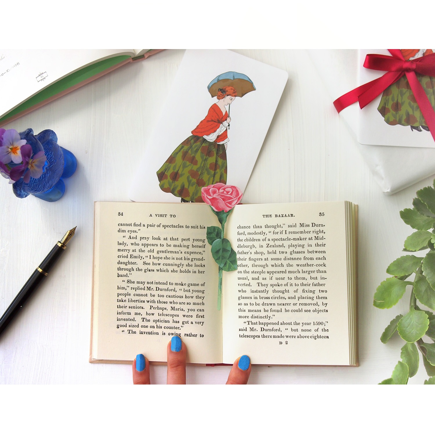花瓶から引き出した薔薇の花はしおりにも出来ます。